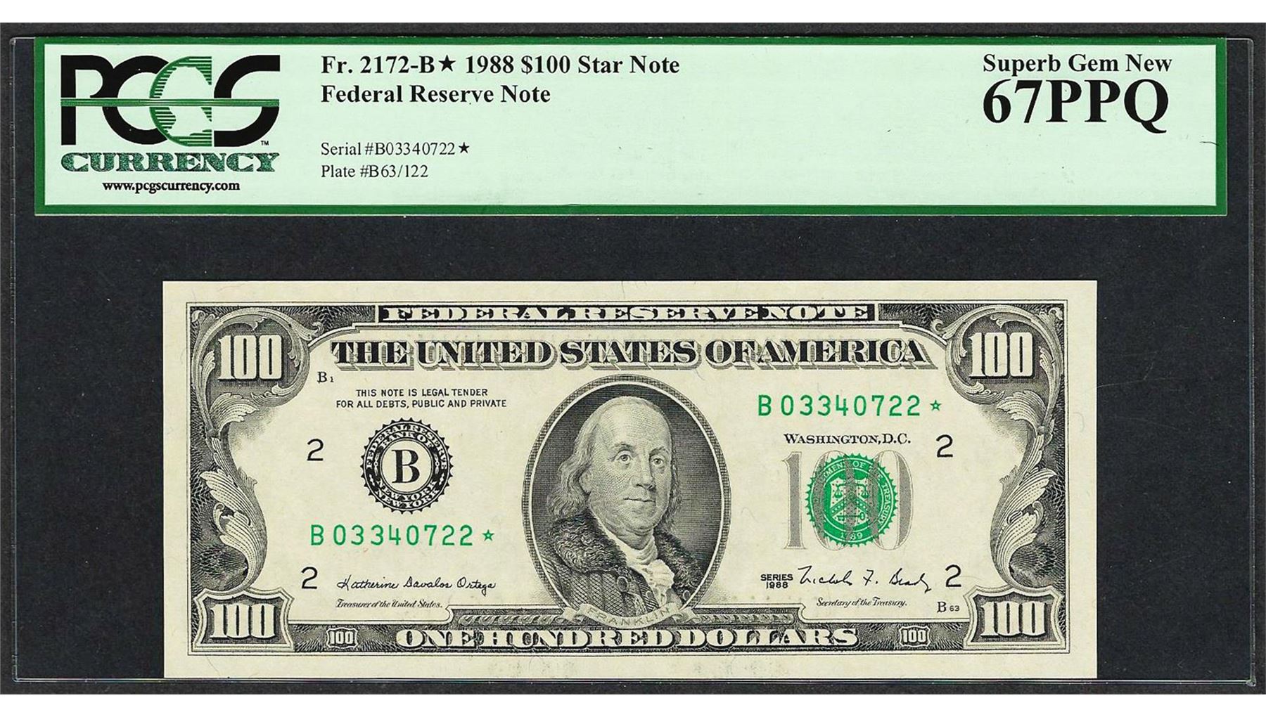 One 1988 $100 Federal Reserve STAR Note New York Fr.2172-B* PCGS Superb Gem New 67PPQ. PCGS Graded.