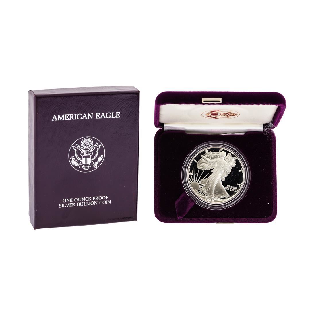 One 1988 1oz American Silver Eagle Proof Coin with Box.
