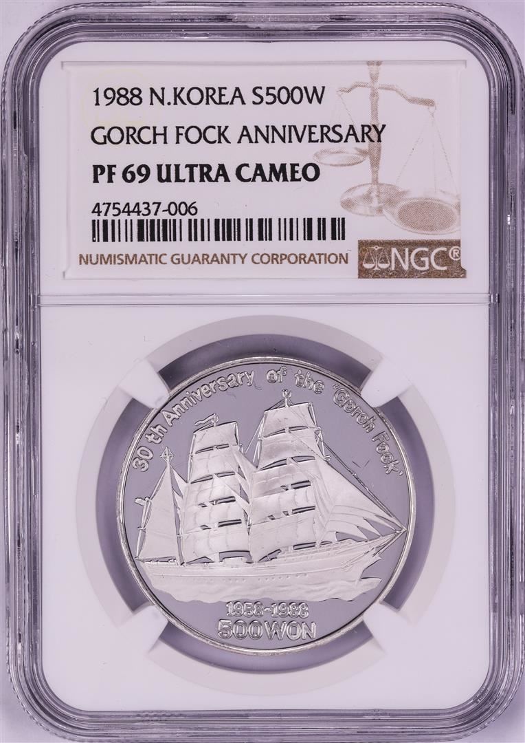 One 1988 N. Korea 500 Won Proof Gorch Fock Anniversary Silver Coin PF69 Ultra Cameo.