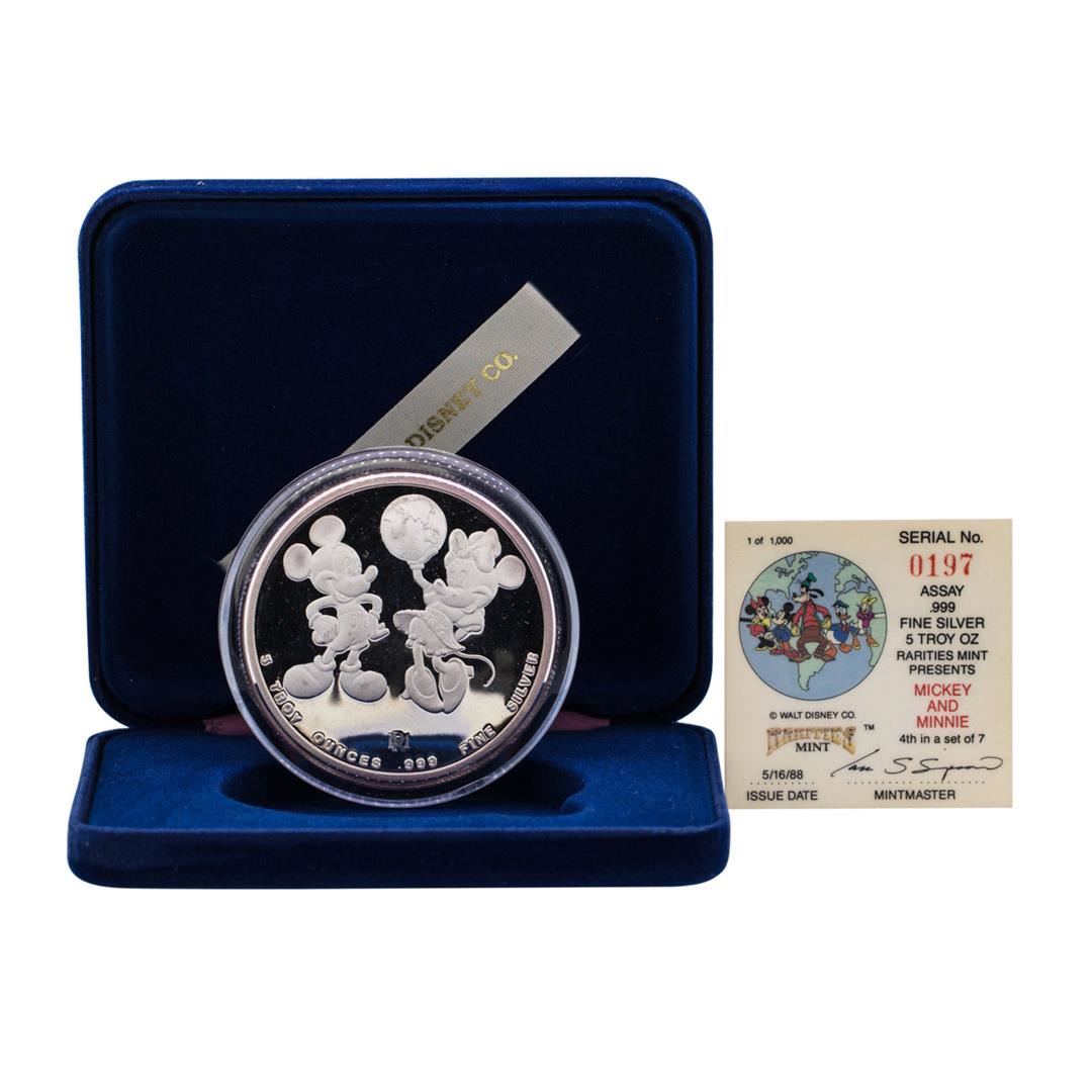 One 1988 Rarities Mint Walt Disney Around the World 5 oz .999 Silver Coin w/Box & COA.