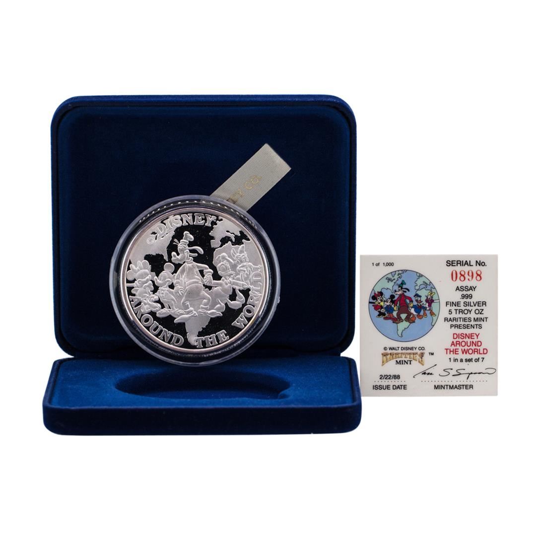 One 1988 Rarities Mint Walt Disney Around the World 5 oz .999 Silver Coin w/Box & COA.