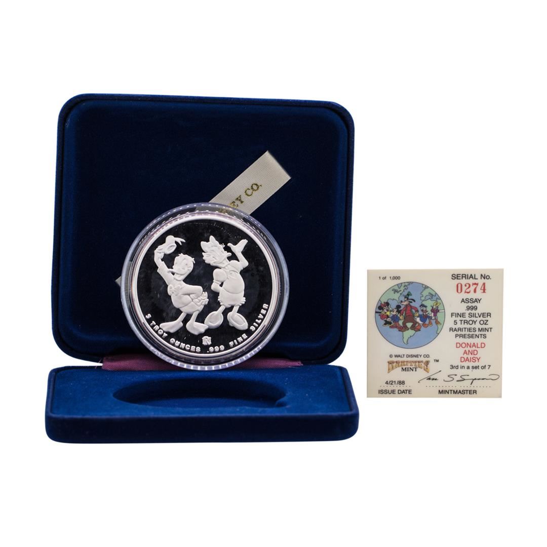One 1988 Rarities Mint Walt Disney Donald & Daisy 5 oz .999 Silver Coin w/Box & COA.