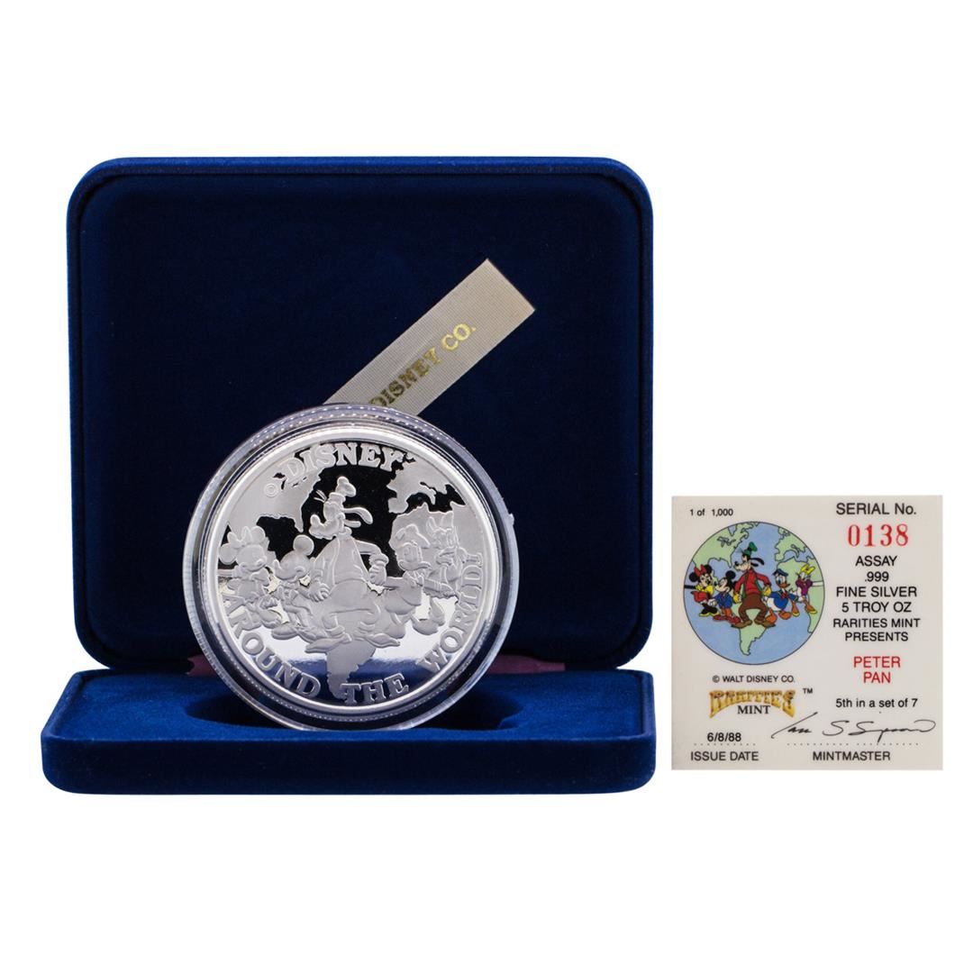 One 1988 Rarities Mint Walt Disney Peter Pan 5 oz .999 Silver Coin w/Box & COA.