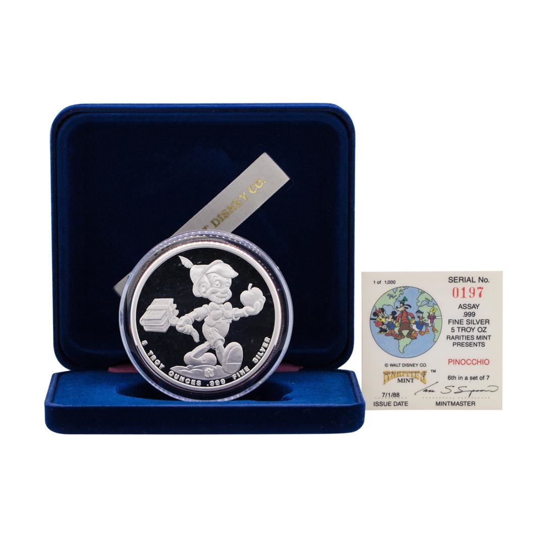 One 1988 Rarities Mint Walt Disney Pinocchio 5 oz .999 Silver Coin w/Box & COA.