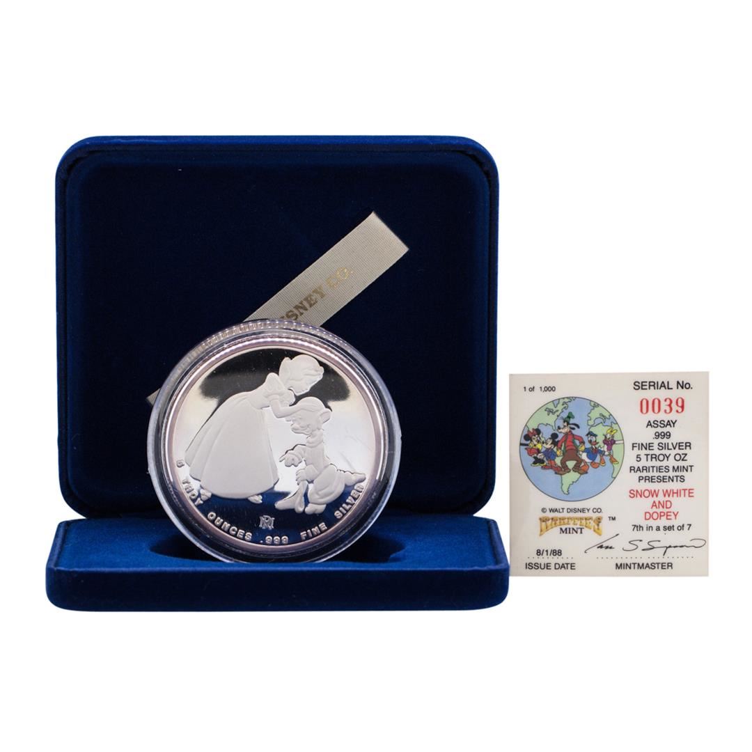 One 1988 Rarities Mint Walt Disney Snow White and Dopey 5 oz .999 Silver Coin w/Box & COA.