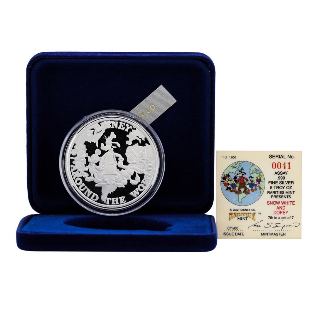 One 1988 Rarities Mint Walt Disney Snow White and Dopey 5 oz. .999 Silver Coin w/Box & COA.