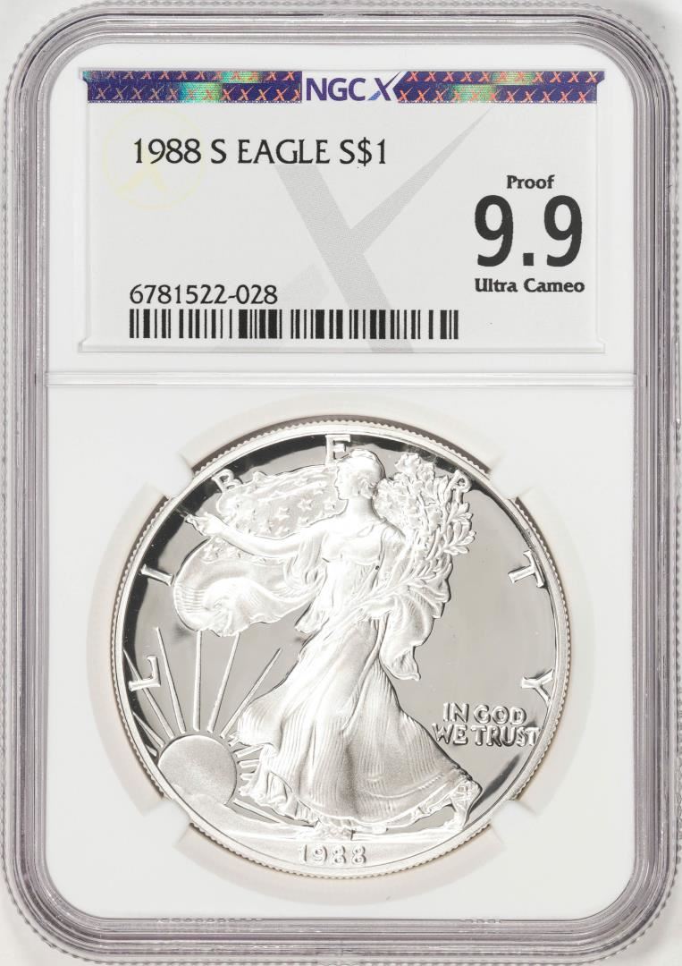 One 1988-S $1 American Silver Eagle Coin NGCX Proof 9.9 Ultra Cameo. NGC Certified.
