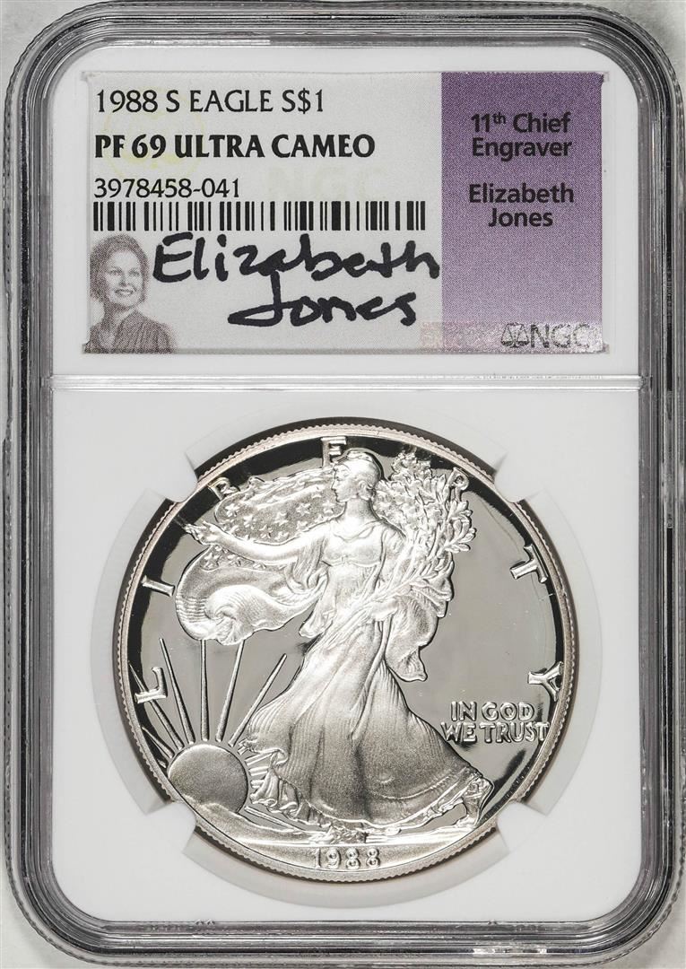 One 1988-S $1 Proof American Silver Eagle Coin NGC PF69 Ultra Cameo Elizabeth Jones Signature. NGC Certified.