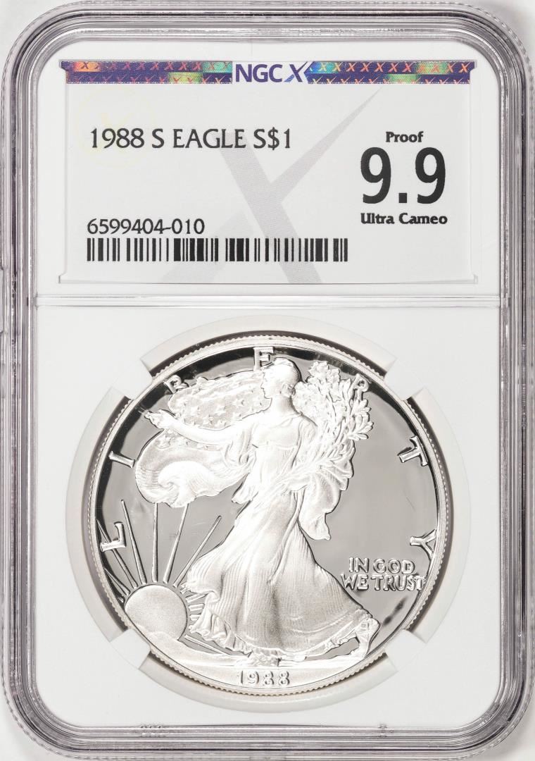 One 1988-S $1 Proof American Silver Eagle Coin NGCX Proof 9.9 Ultra Cameo. NGCX Certified.