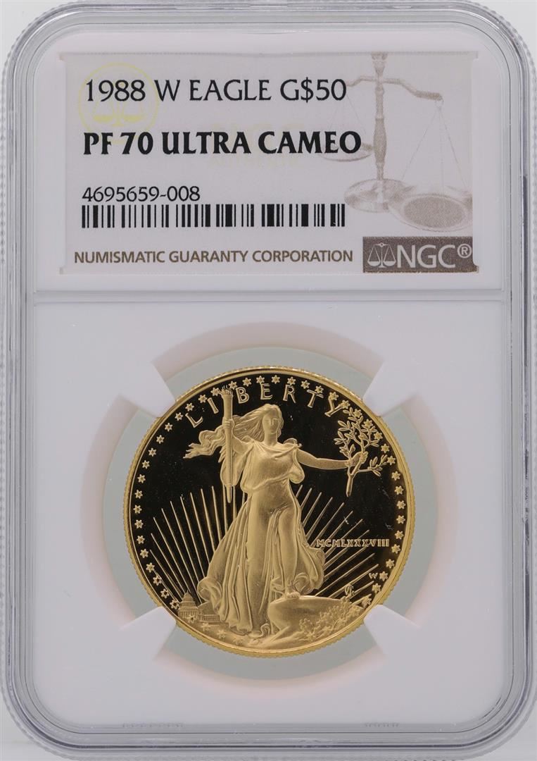 One 1988-W $50 American Gold Eagle Coin NGC PF70 Ultra Cameo. NGC Certified.