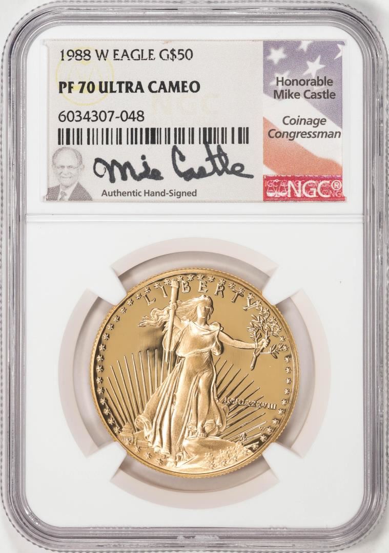 One 1988-W $50 Proof American Gold Eagle Coin NGC PF70 Ultra Cameo Castle Signature. NGC Certified.