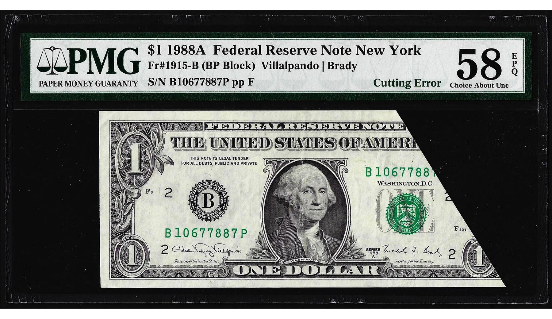 1988A $1 Federal Reserve Note Cutting ERROR PMG Choice About Uncirculated 58EPQ