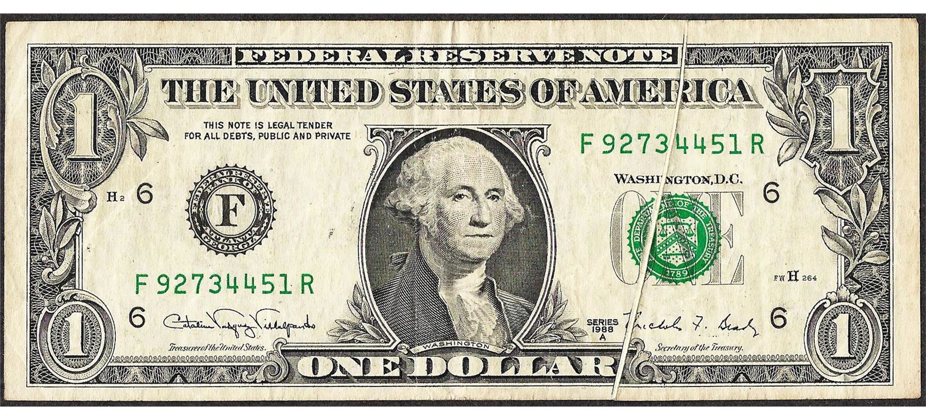 One 1988A $1 Federal Reserve Note ERROR Gutter Fold.