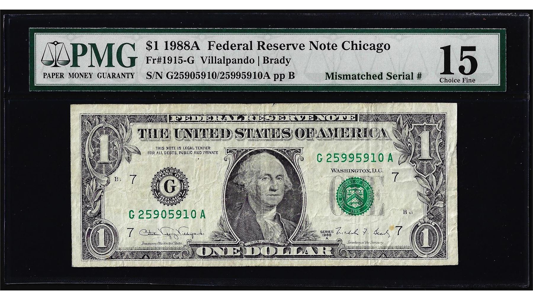One 1988A $1 Federal Reserve Note Mismatched Serial Number ERROR PMG Choice Fine 15. PMG Certified.