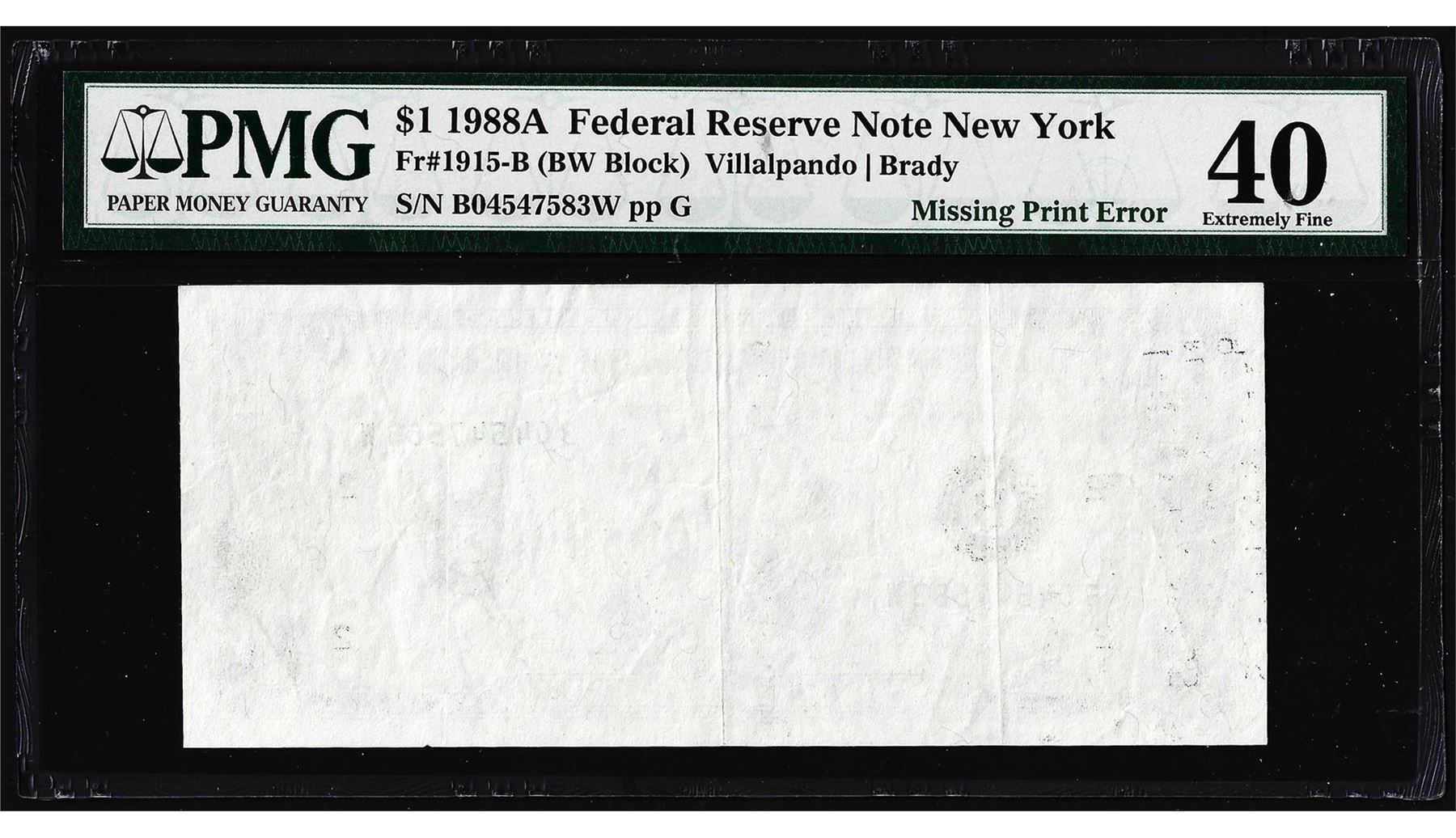 One 1988A $1 Federal Reserve Note Missing Print ERROR Fr.1915-B PMG Extremely Fine 40. PMG Certified.