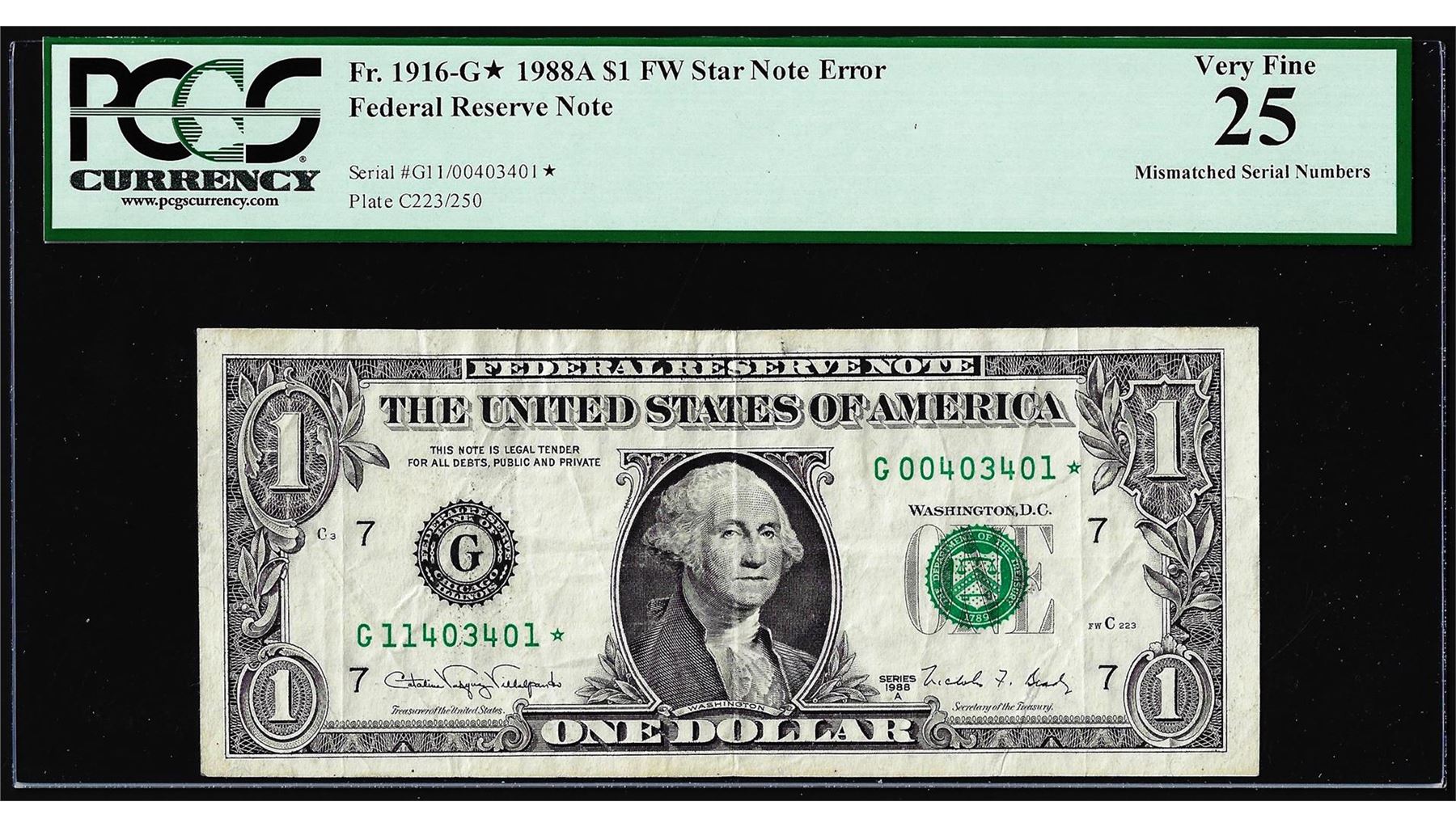 One 1988A $1 Federal Reserve STAR Note Mismatched Serial Number ERROR PCGS Very Fine 25. PCGS Graded.