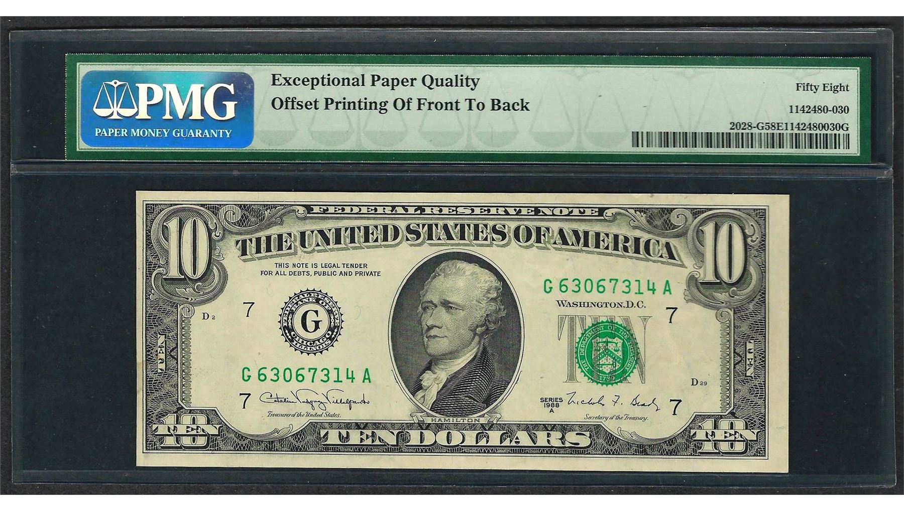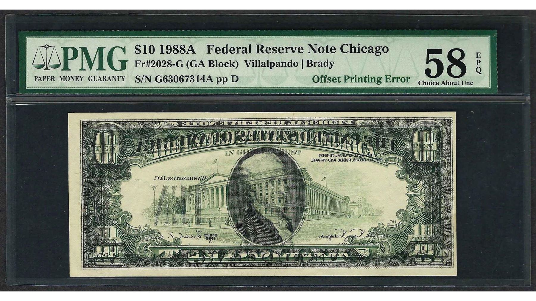 One 1988A $10 Federal Reserve Note ERROR Offset Printing PMG Choice AU 58EPQ. PMG Certified.