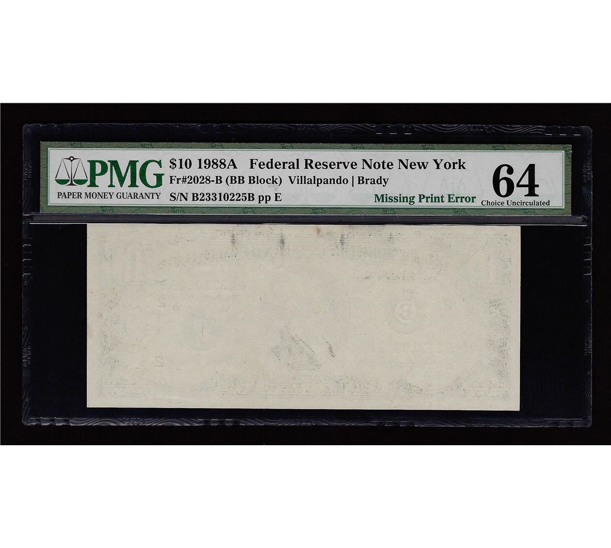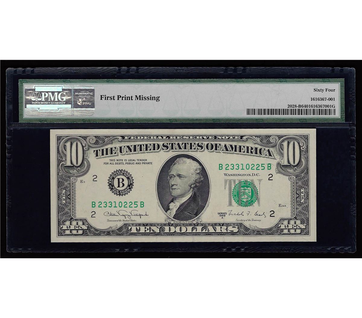 One 1988A $10 Federal Reserve Note Missing Print Error PMG CU64. PMG Certified.