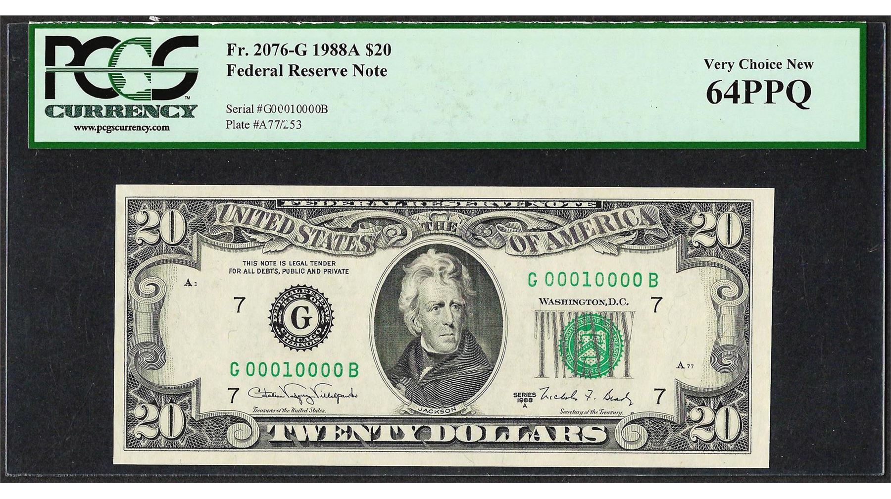 One 1988A $20 Federal Reserve Note Fr.2076-G PCGS Very Choice New 64PPQ Fancy Serial. PCGS Graded.
