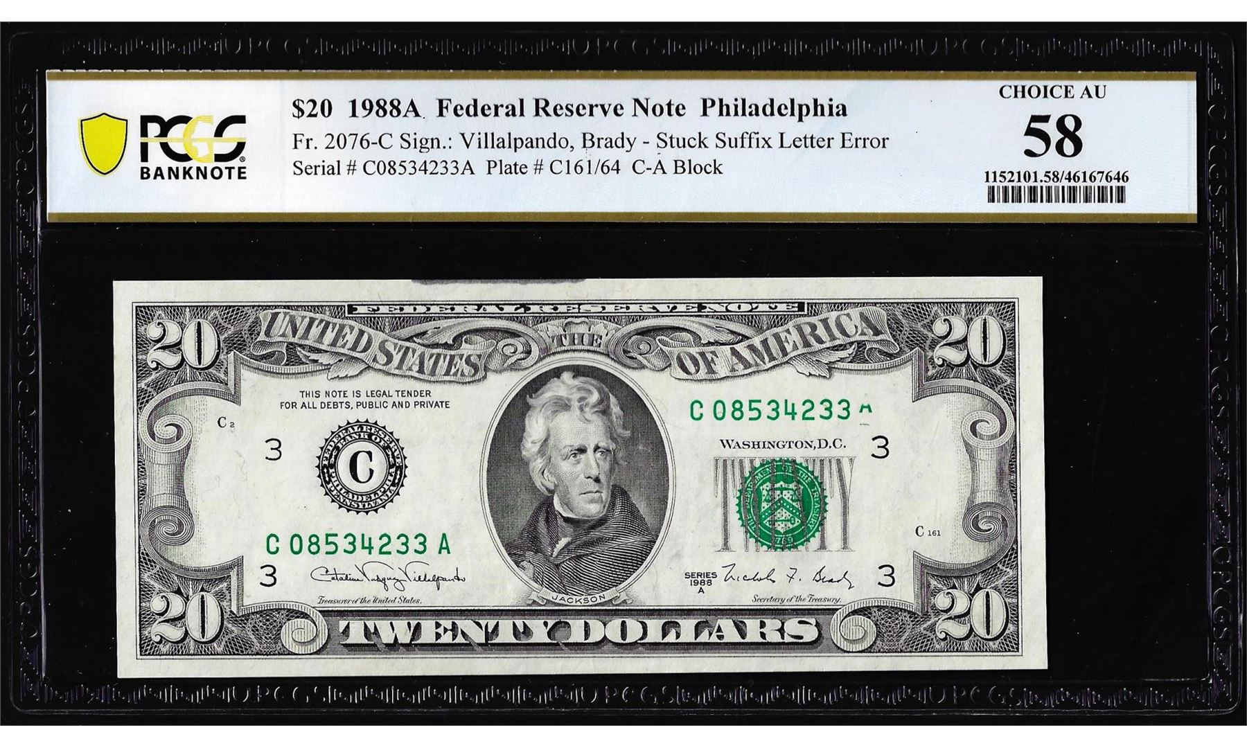 One 1988A $20 Federal Reserve Note Stuck Suffix Letter Error PCGS Choice About Unc. 58. PCGS Graded.