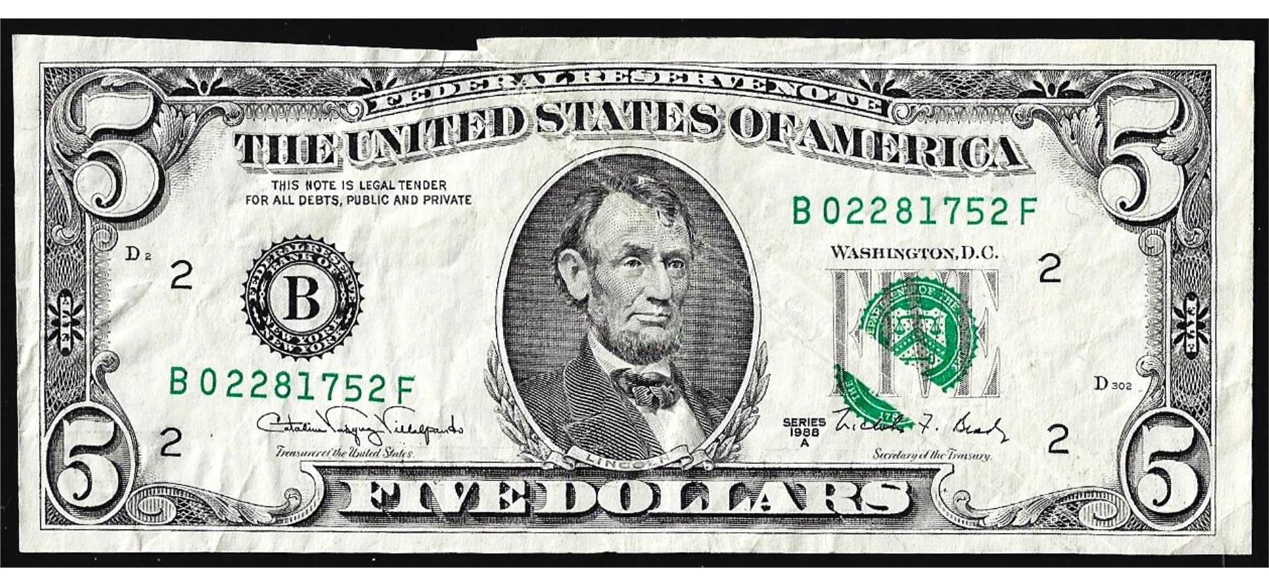 One 1988A $5 Federal Reserve Note New York Gutter Fold Error.