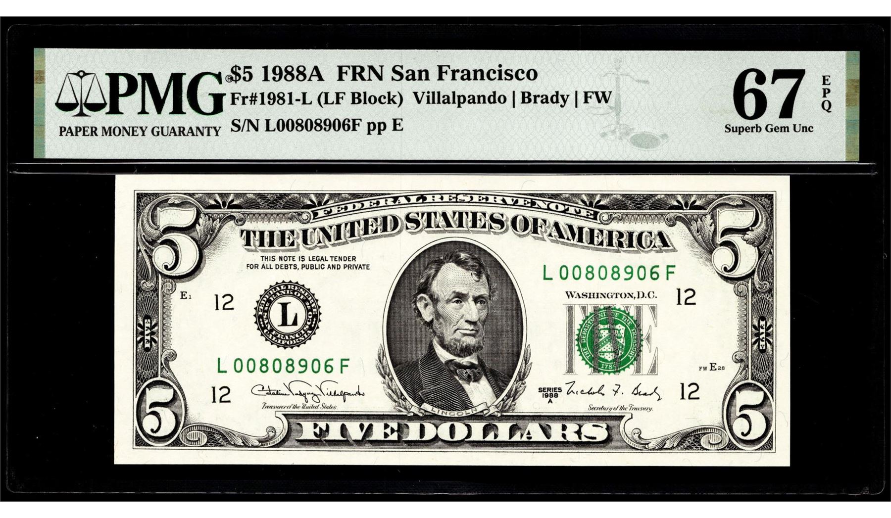 One 1988A $5 Federal Reserve Note San Francisco Fr.1981-L PMG Superb Gem Unc 67EPQ. PMG Certified.