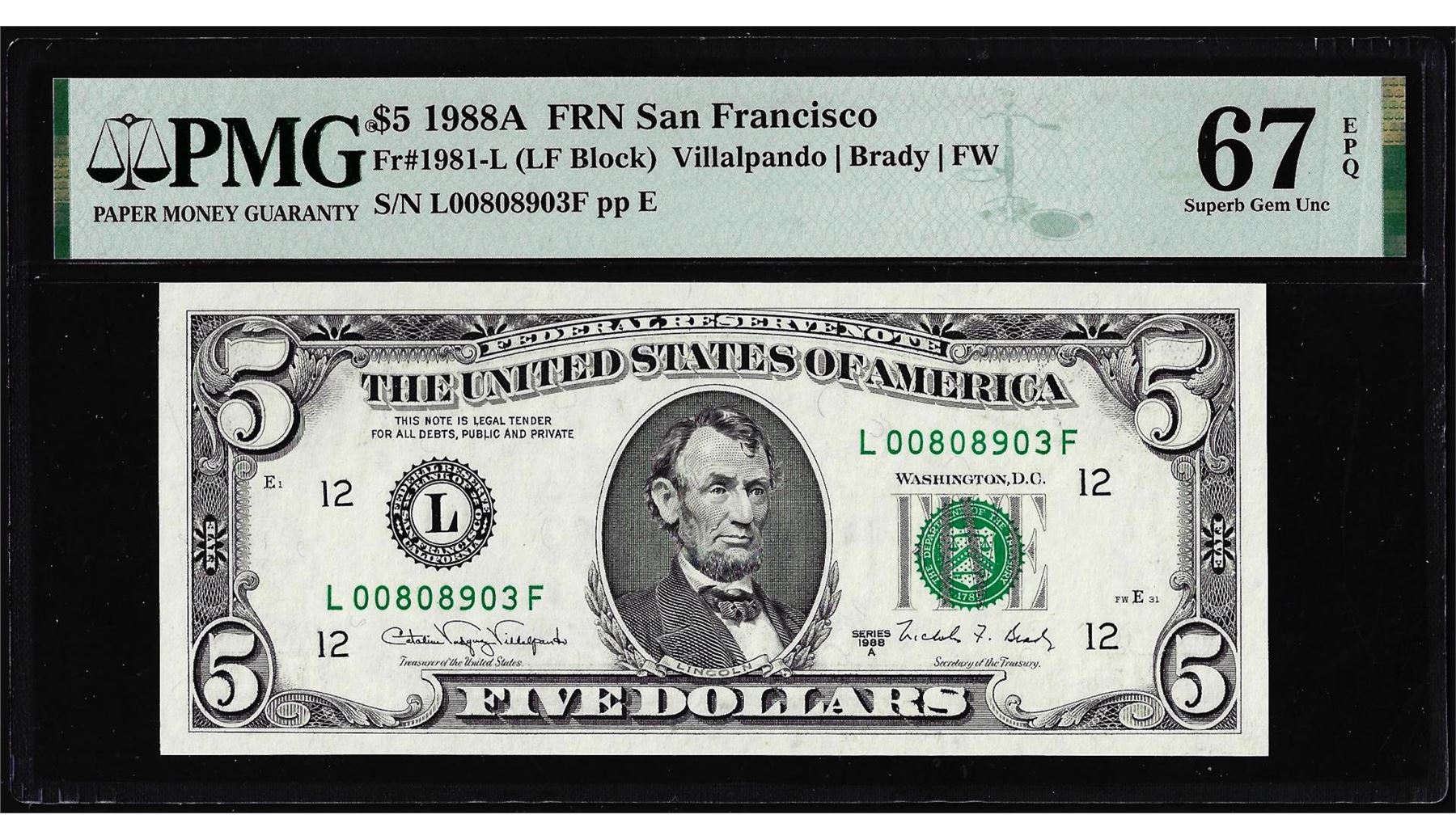 One 1988A $5 Federal Reserve Note San Francisco Fr.1981-L PMG Superb Gem Unc 67EPQ. PMG Certified.