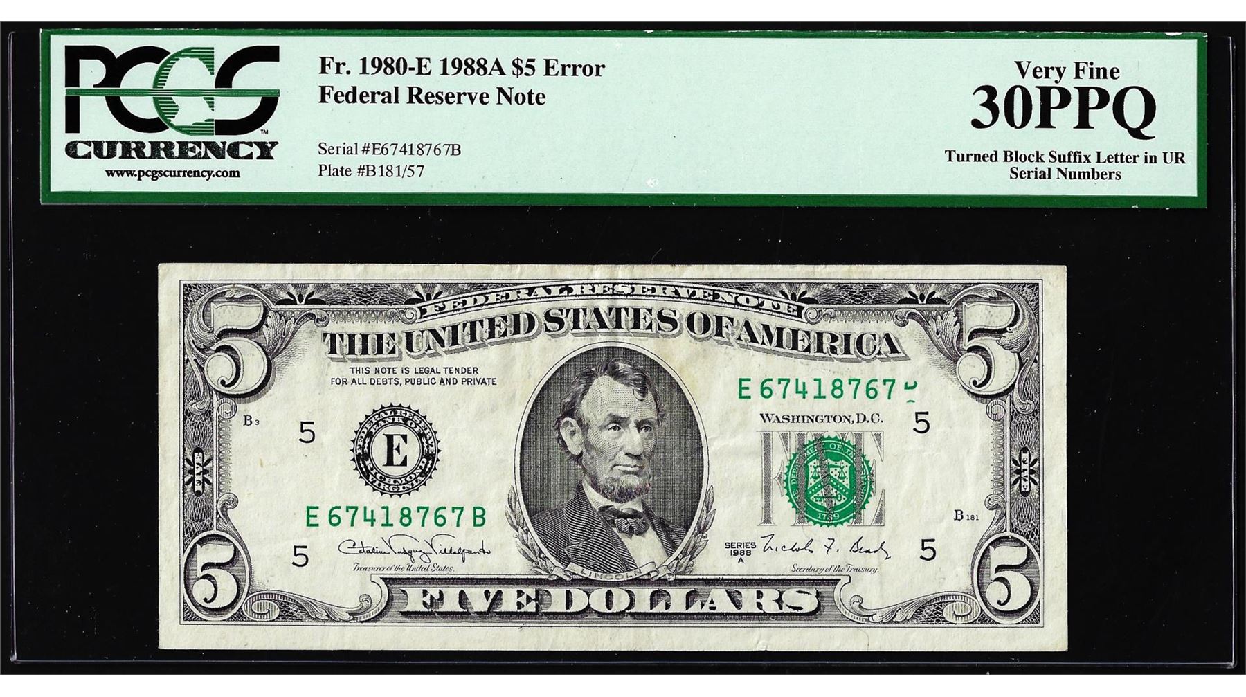 One 1988A $5 Federal Reserve Note Turned Block Suffix Letter Error PCGS Very Fine 30PPQ. PCGS Graded.