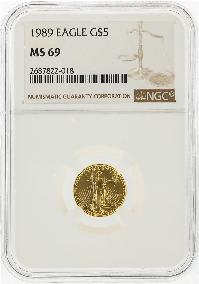 One 1989 $5 American Gold Eagle Coin NGC Graded MS69. NGC Certified.
