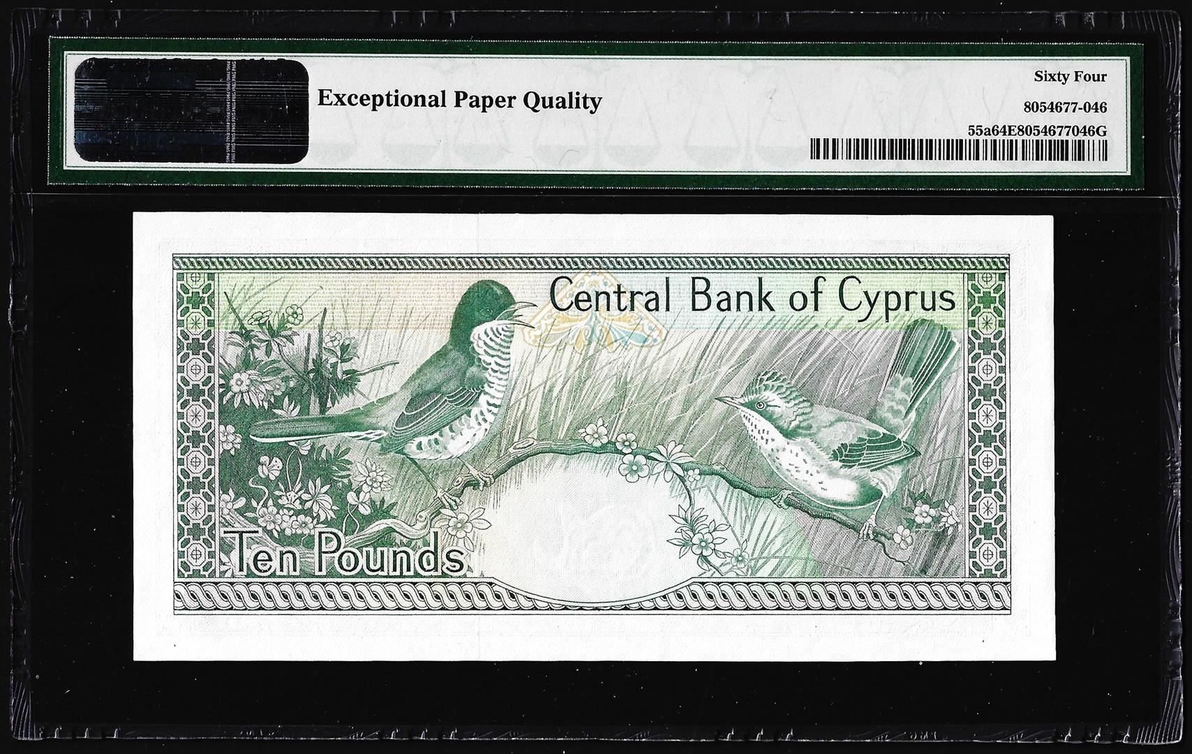 One 1989-90 Cyprus Central Bank 10 Pounds Note Pick# 55a PMG Choice Uncirculated 64EPQ. PMG Certified.