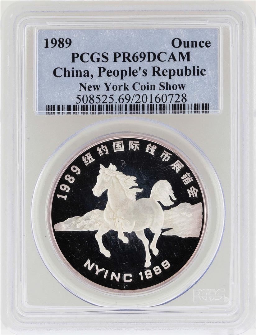 One 1989 China 1 oz. New York Coin Show Silver Horse Coin PCGS PR69DCAM. PCGS Graded.