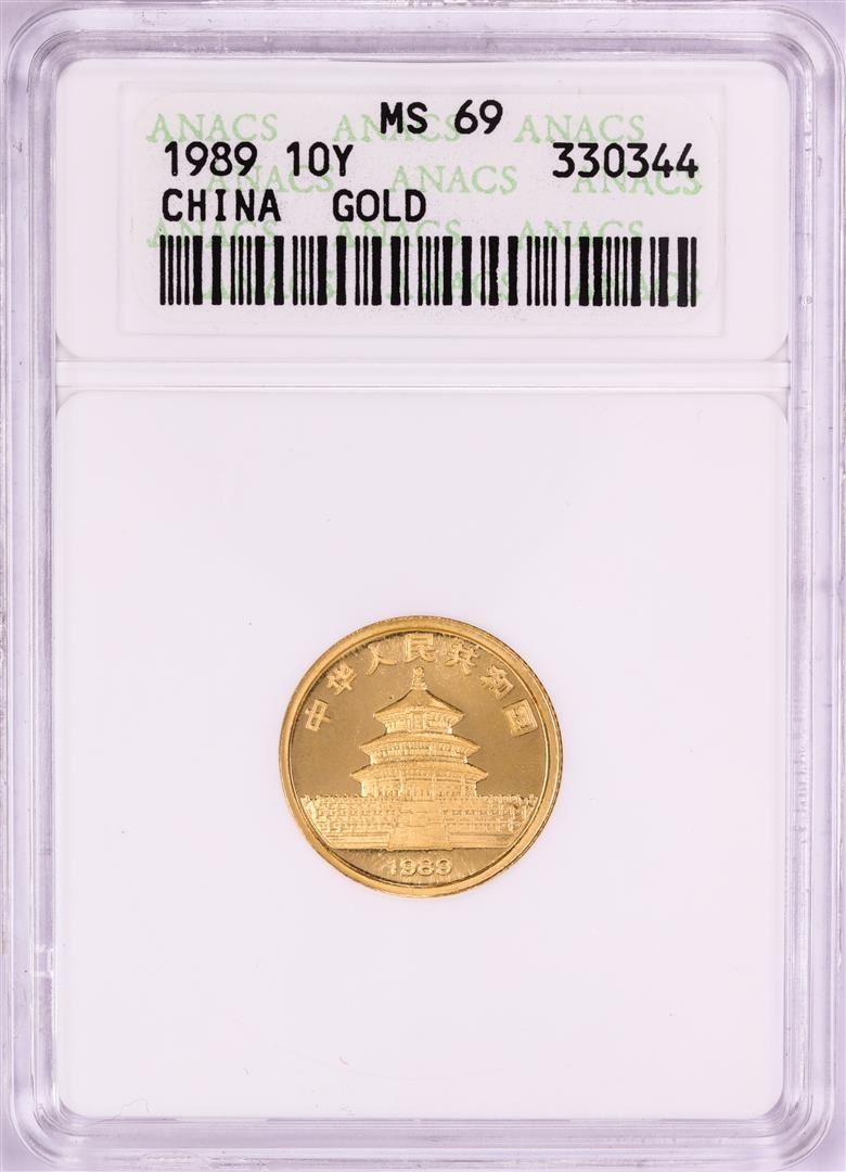 One 1989 China 10 Yuan 1/10 Oz. Gold Panda Coin ANACS MS69. ANACS Certified.