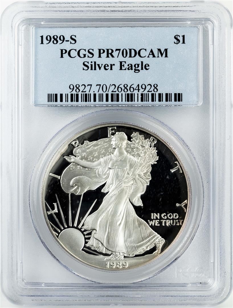 One 1989-S $1 Proof American Silver Eagle Coin PCGS PR70DCAM. PCGS Graded.
