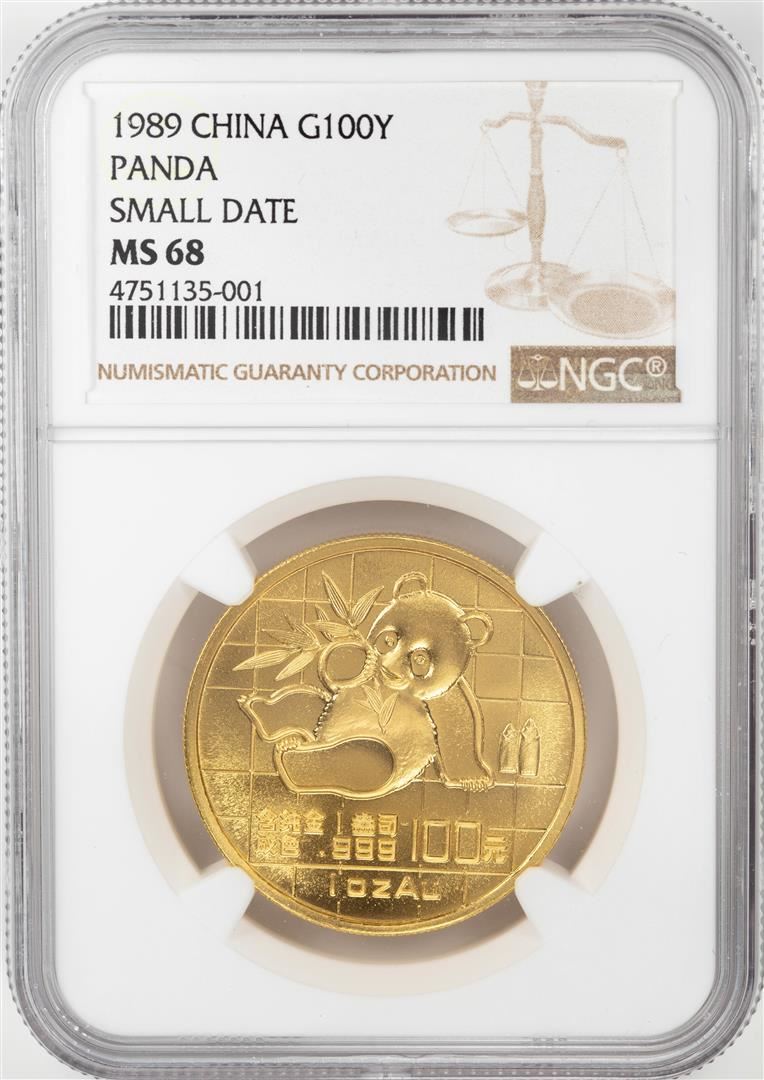 One 1989 Small Date China 100 Yuan Panda Gold Coin NGC MS68. NGC Certified.