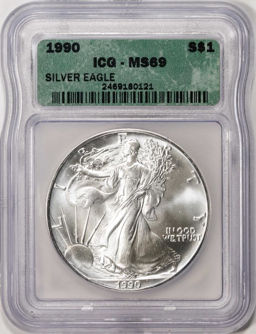 One 1990 $1 American Silver Eagle Coin ICG MS69. ICG Certified.