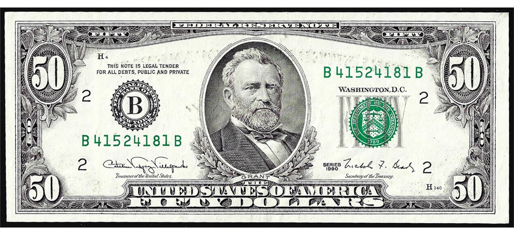 One 1990 $10 Federal Reserve Note Partial Front to Back Offset ERROR.
