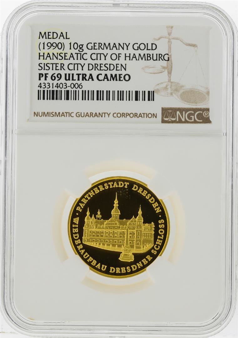 One 1990 10g Germany Gold Hamburg Sister City Dresden Medal NGC Graded PF69 Ultra Cameo. NGC Certified.