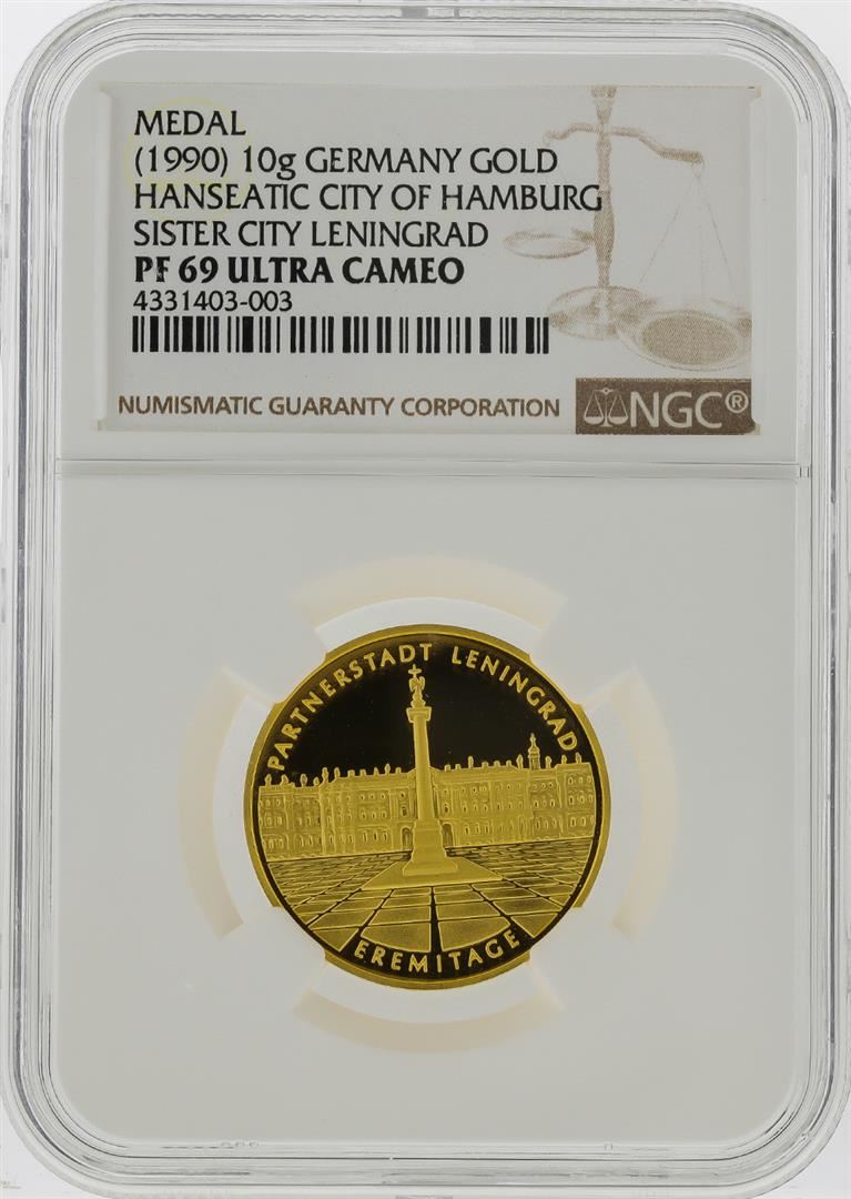One 1990 10g Germany Gold Hamburg Sister City Leningrad Medal NGC Graded PF69 Ultra Cameo. NGC Certified.