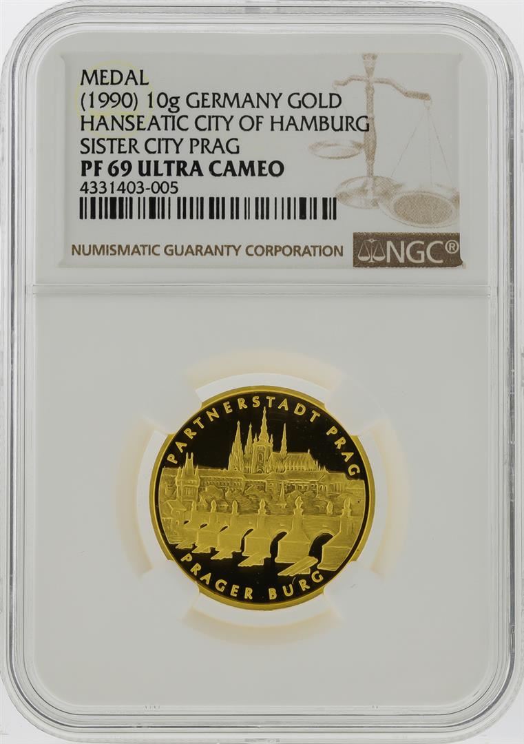 One 1990 10g Germany Gold Hamburg Sister City Prag Medal NGC Graded PF69 Ultra Cameo. NGC Certified.