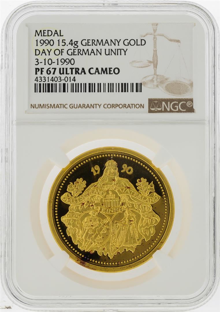 One 1990 15.4g Germany Gold Day Of Germany Unity Medal NGC Graded PF67 Ultra Cameo. NGC Certified.