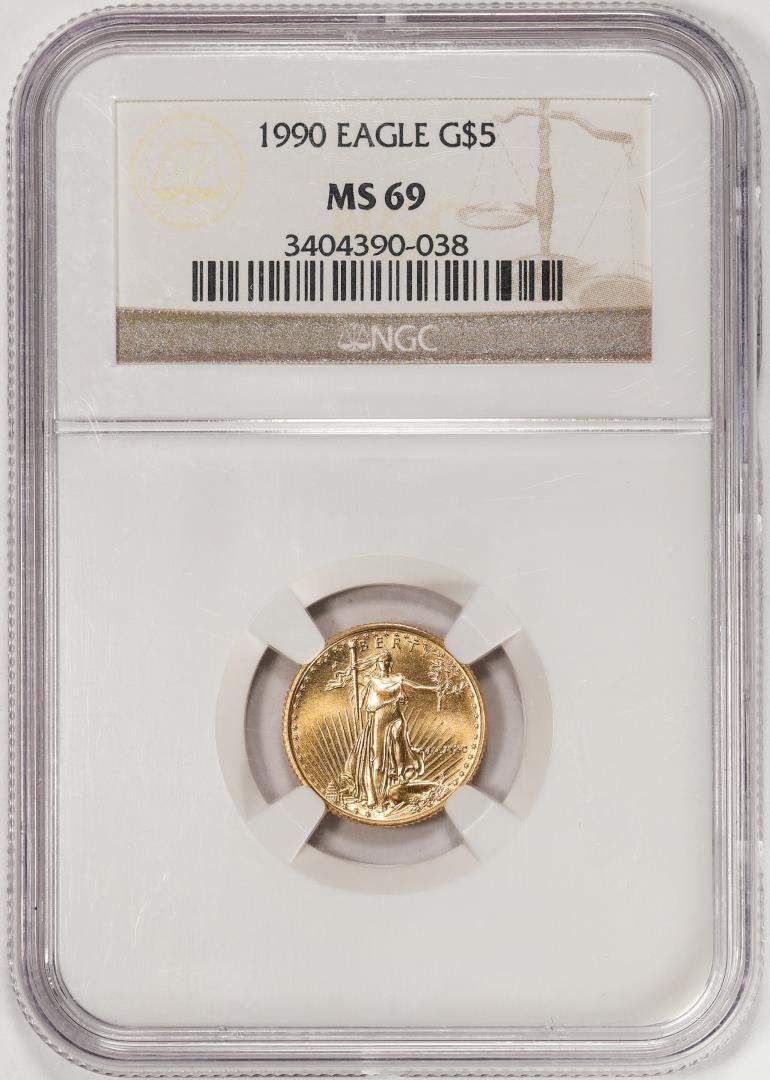 One 1990 $5 American Gold Eagle Coin NGC MS69. NGC Certified.