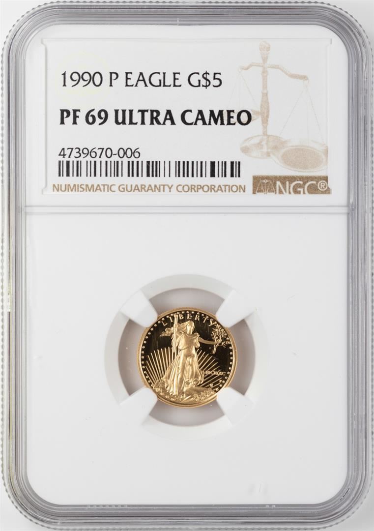 One 1990-P $5 Proof American Gold Eagle Coin NGC PF69 Ultra Cameo. NGC Certified.