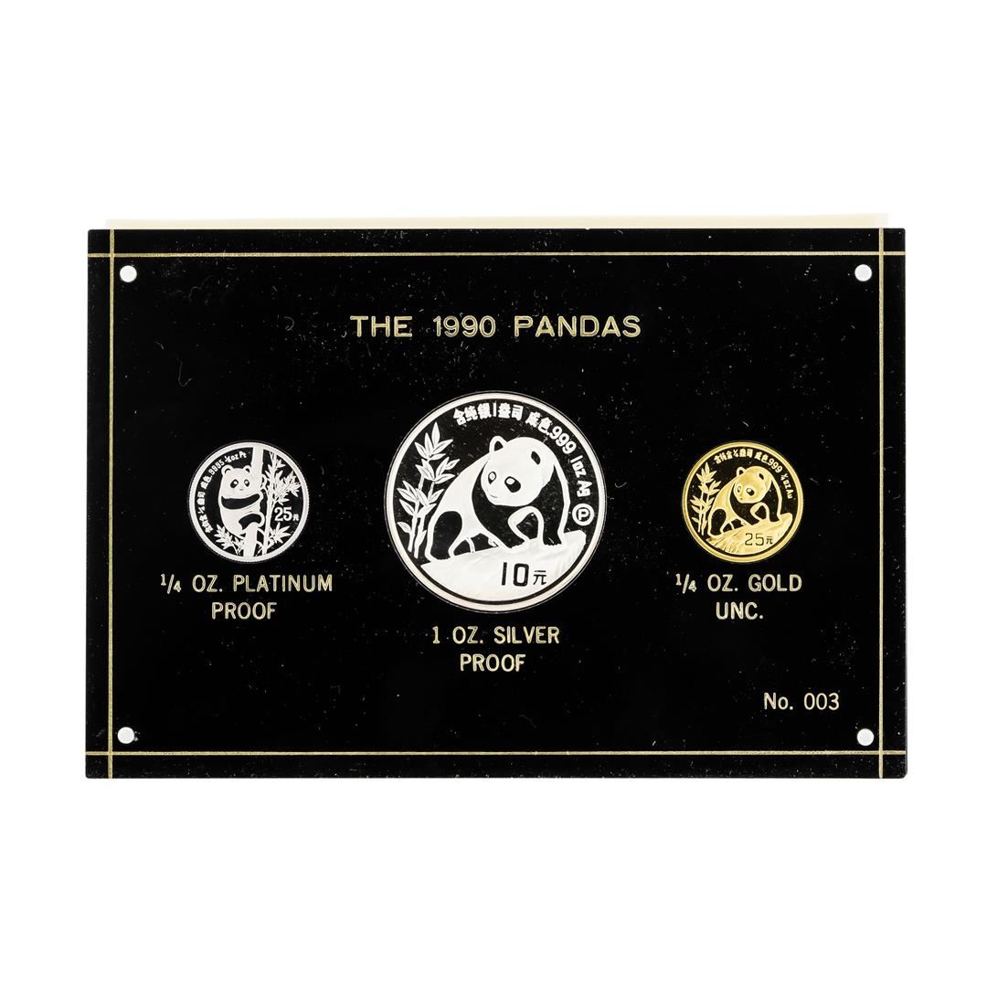 One 1990 Panda Premier Tri Metallic Coin Set. (1) 10 Yuan 1/4 oz platinum proof coin, (1) 25 Yuan 1/4 gold coin, and (1) 10 yuan silver proof coin.