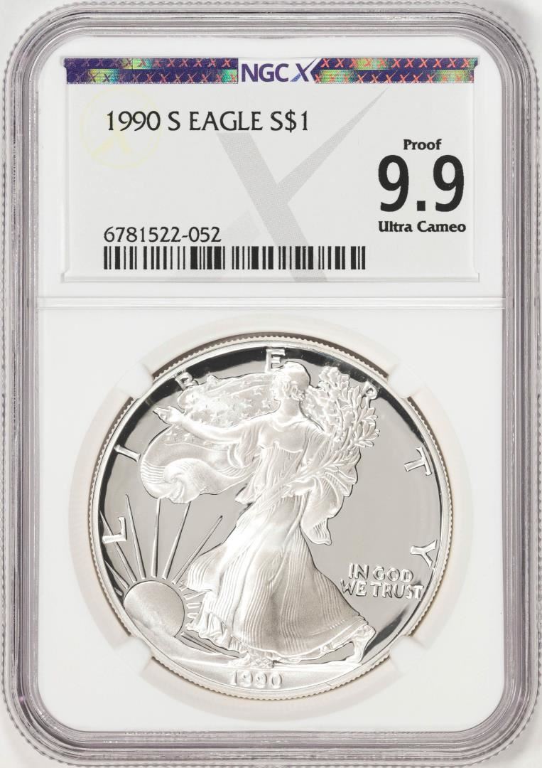 One 1990-S $1 American Silver Eagle Coin NGCX Proof 9.9 Ultra Cameo. NGC Certified.