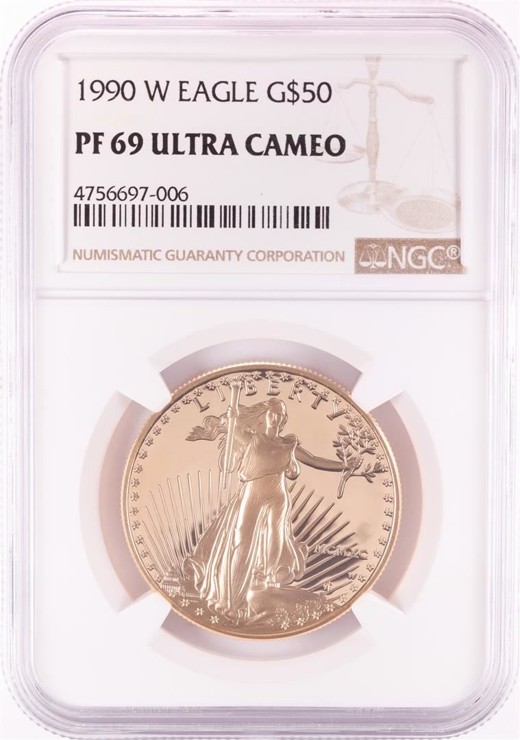 One 1990-W Proof $50 American Gold Eagle Coin NGC PF69 Ultra Cameo. NGC Certified.