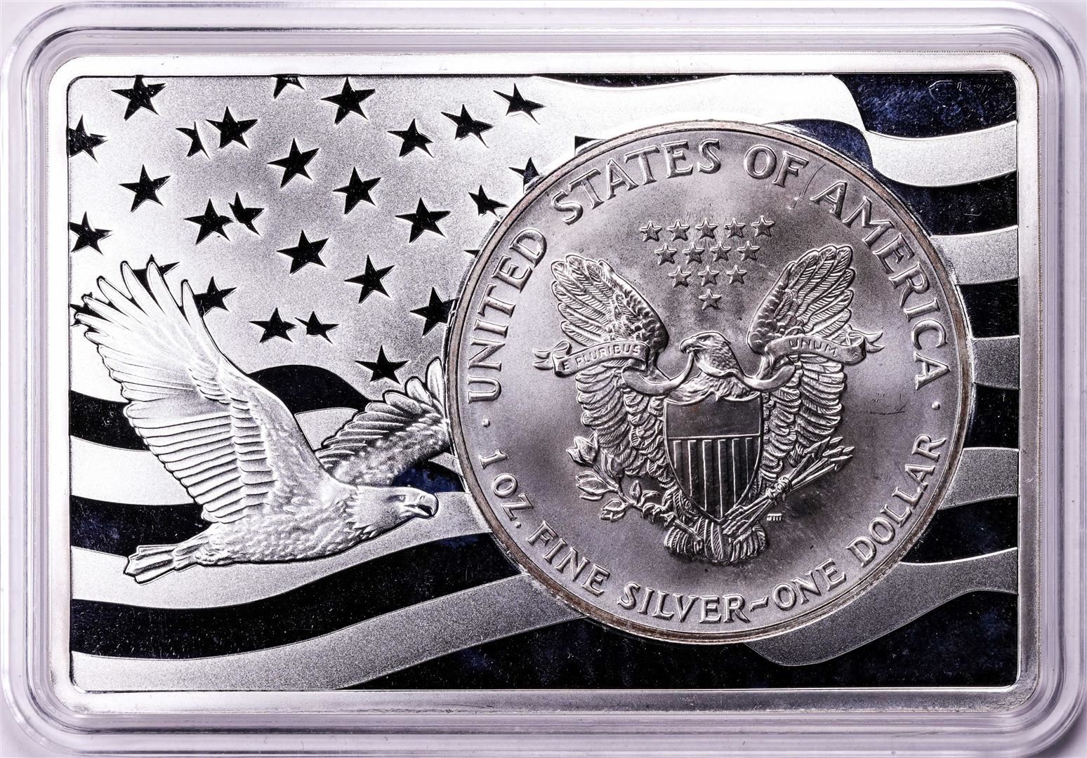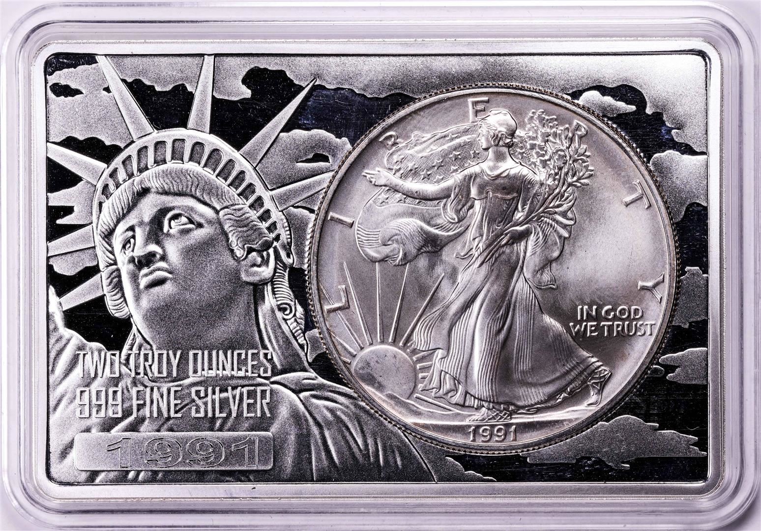 One 1991 $1 American Silver Eagle Coin & 2oz Silver Bar Set.