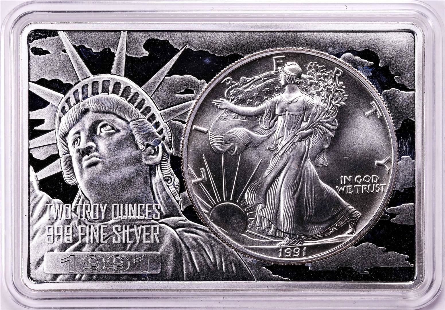 One 1991 $1 American Silver Eagle Coin & 2oz Silver Bar Set.