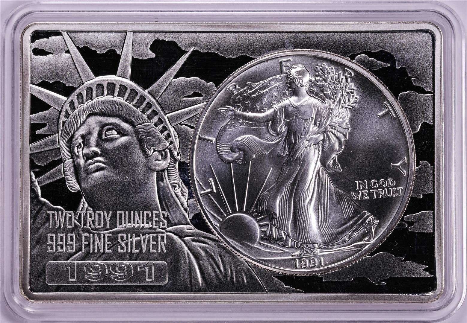 One 1991 $1 American Silver Eagle Coin & 2oz Silver Bar Set.