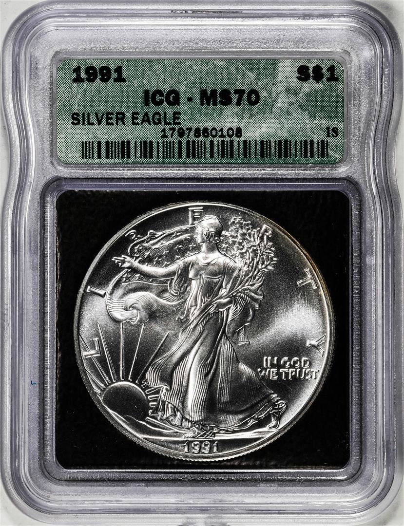 One 1991 $1 American Silver Eagle Coin ICG MS70. ICG Certified.