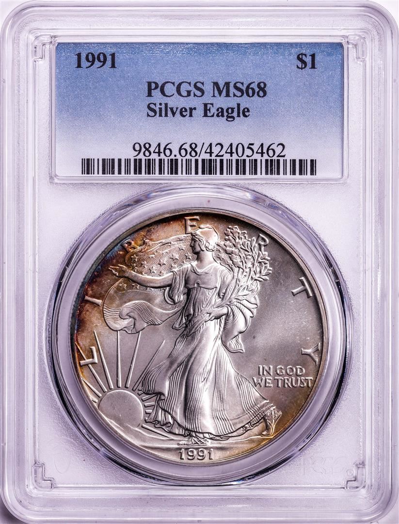One 1991 $1 American Silver Eagle Coin PCGS MS68 Nice Toning. PCGS Graded.